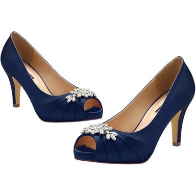 Peep Toe Mid Heels for Woman Rhinestones Satin Evening Prom Wedding Shoes